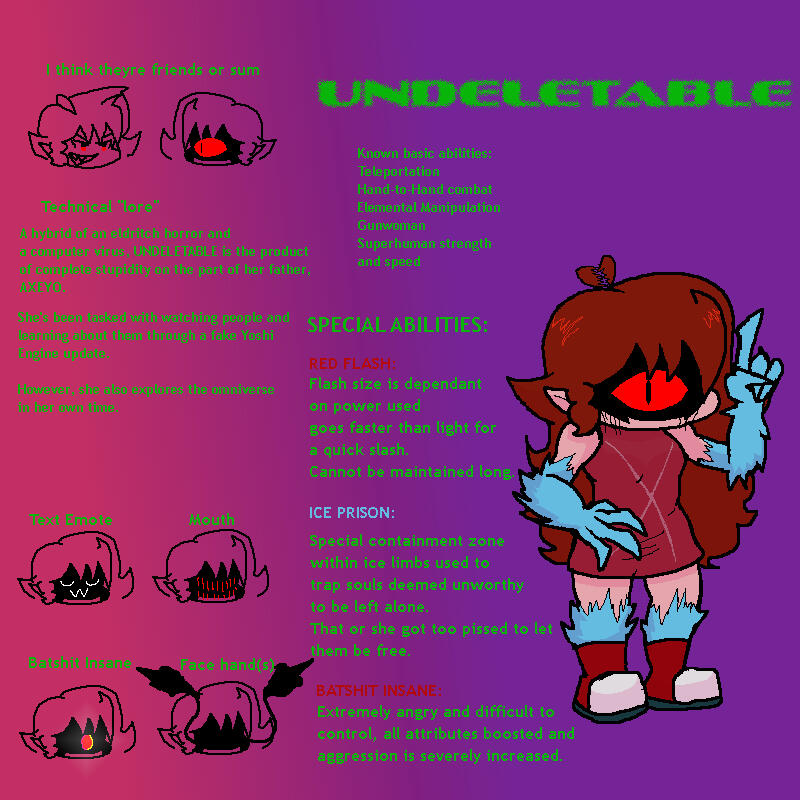 You can tell I suck.Anyway, she was supposed to be a GF EXE, but honestly she's just a stupid overpowered character I use for fun.She's a Demon/Virus hybrid, thanks to the stupidity of her dad, AXEYO.Drawn by ma friend @SPIRYONYYX