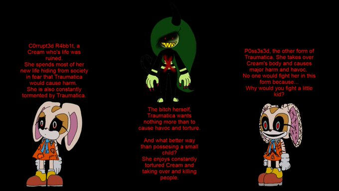 A Cream who got really unlucky and was stuck with Traumatica. She hides from society to minimize the threat of Traumatica, also subjecting herself to Traumatica's torment.And Traumatica is exactly what you think. Sonic.EXE but Zeena.
